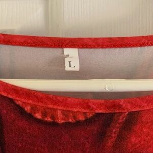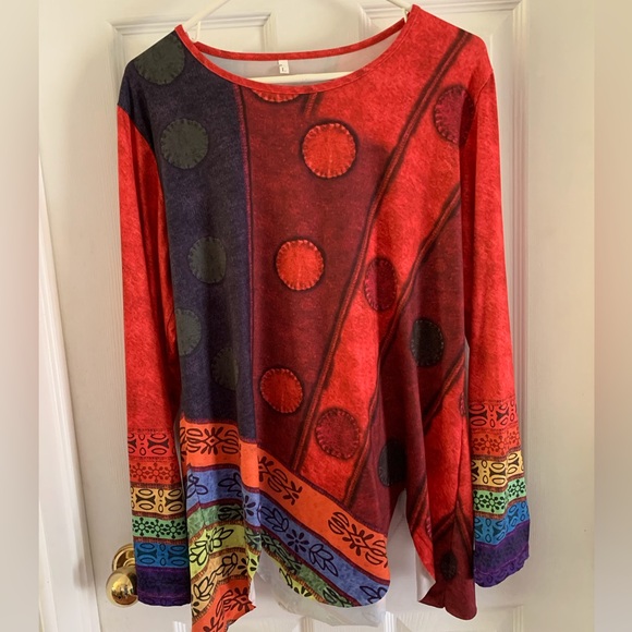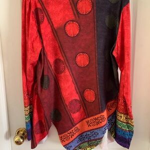 Unbranded red patterned tunic top with cut scalloped hem. Red, orange, yellow, green, blue and purple details.