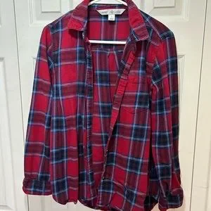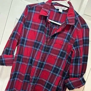 Stylish red plaid button-up shirt with rolled sleeves. Perfect for casual wear.