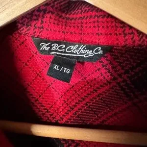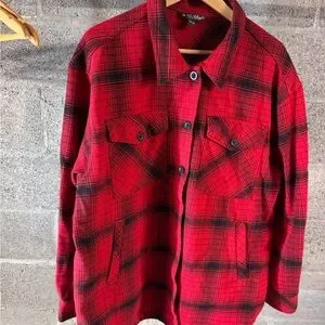 Classic red and black plaid design. Features button-up front and dual chest pockets. Ideal for layering.
