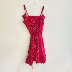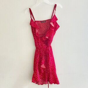 Red polka dot mini wrap dress with adjustable straps and a flattering wrap style. The playful polka dot pattern adds a vintage touch, while the ruffled hem enhances adds some flare. Perfect for summer outings or casual gatherings, this dress is a must-have for adding a splash of color to your wardrobe.