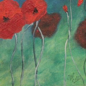 Acrylic painting of some abstract poppies, perfect for Remembrance Day or year round decor. Darker poppies in the background, more detailed and brighter poppies in the foreground. Colours are blue, green, red.
