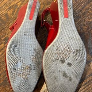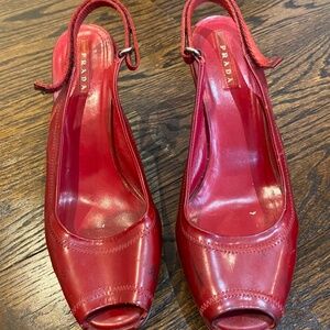 Used Red Prada Platform Sandals for use. All red, patent-leather slingback. Made in Italy. Size 8 US but can fit an 8.5. Showing many signs of use including scuffing. Please look at photos for more info on the marks