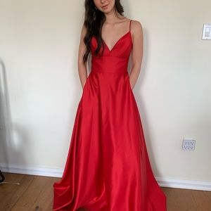 Red long satin prom dress with pockets! Only been worn once to my prom, fits a size small. Originally bought for $450. Pick up from porch