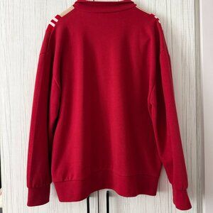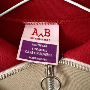 Eye-catching Between A and B (A∧B) knit pullover in a bold red and beige color block design. Features a retro-inspired V-panel stripe detail and a silver ring half-zip for a sporty, preppy touch. Made in Korea, this piece pairs perfectly with jeans, skirts, or trousers for a chic, vintage-inspired streetwear look.