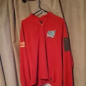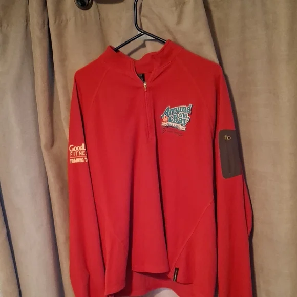 Stylish red quarter-zip pullover with logo details. Perfect for casual wear.