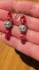 Red beaded double necklace and three pairs of earrings. one pair of which has cute flower beads in the middle.