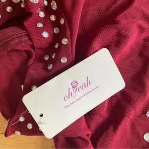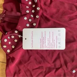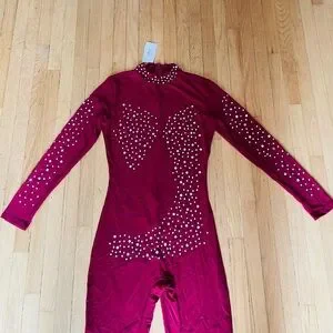 Elegant red bodysuit adorned with sparkling rhinestones. Perfect for performances or special occasions.