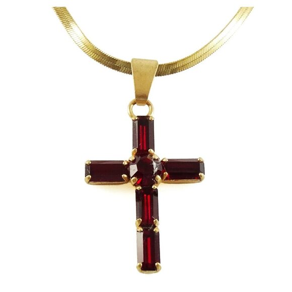 Red Rhinestone Cross Pendant on Flat Chain Necklace Religious Jewelry