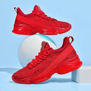 🆕 Red Rhinestone Mesh Slip-On Walking Shoes Fashion Glitter Breathable Sneaker