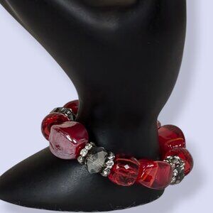 This bracelet is beaded and stretches instead of having an opening or clasp. The bracelet is strung with a beads in a variety of shapes, sizes, and materials. The shiny, long red beads are smooth and made of glass, while the red cylindrical finely faceted beads are made of plastic. The grey/clear faceted beads are made of cut crystal and have rhinestone studded metal discs on either side. There is normal wear, but there are no issues affecting wearability.
