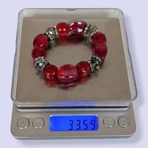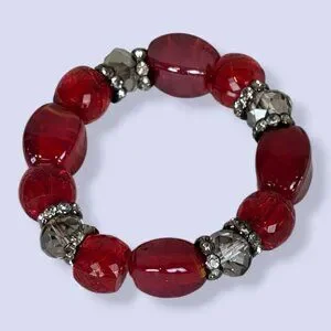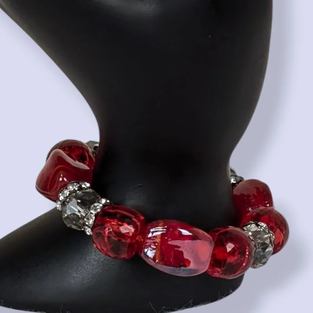 This bracelet is beaded and stretches instead of having an opening or clasp. The bracelet is strung with a beads in a variety of shapes, sizes, and materials. The shiny, long red beads are smooth and made of glass, while the red cylindrical finely faceted beads are made of plastic. The grey/clear faceted beads are made of cut crystal and have rhinestone studded metal discs on either side. There is normal wear, but there are no issues affecting wearability.