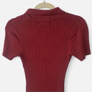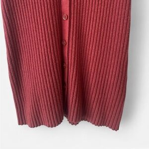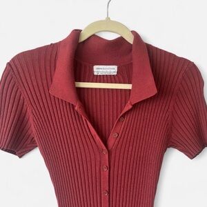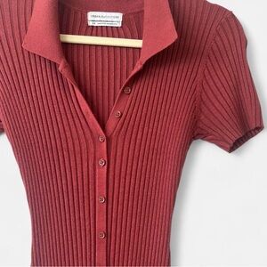 Burnt orange/red button up dress (colour is most accurate in 2nd and 3rd photos), super flattering and comfortable.