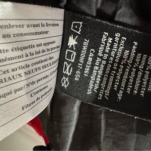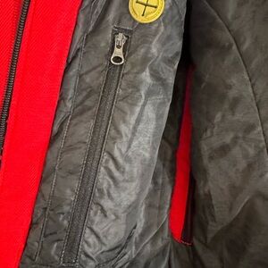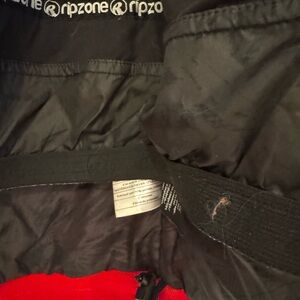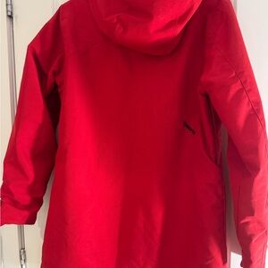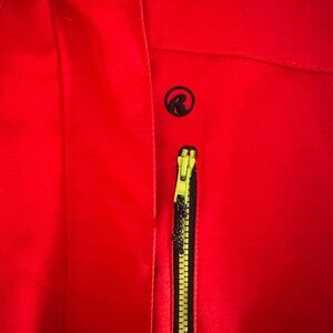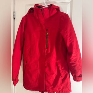 RipZone red hooded winter jacket with front zipper pockets. Underarm ventilation, inside zipper pockets, and an elastic snowband at the waist with snaps and extra drawstring. Warm and stylish.