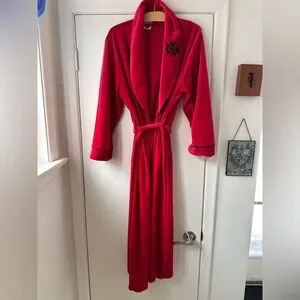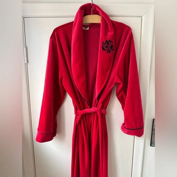 Luxurious vintage red robe with elegant black rose embroidery. Soft and comfortable. Perfect for lounging. Size Medium. Model in photo is size small (petite).