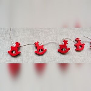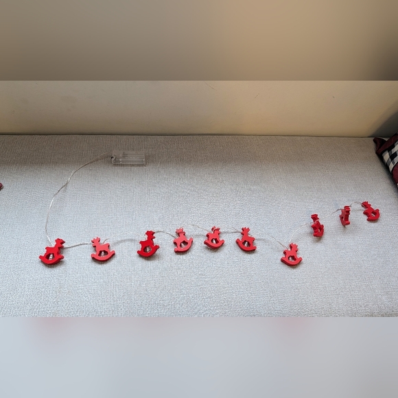 Cute red rocking horse string lights to add a festive touch to any room! They are battery operated, making them easy to place anywhere without needing a plug. They take 2 AA batteries.