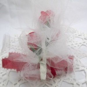 Gorgeous vintage handmade silk flower boutonniere that features 3 bold red miniature silk roses, white netting and matching red ribbon.