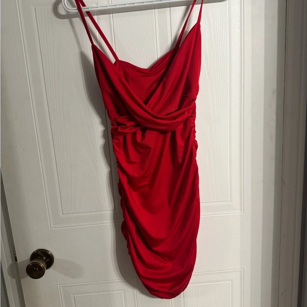 This vibrant red mini dress features a chic ruched design and a stylish wrap effect, perfect for a cocktail night out. The sleeveless slip style is complemented by delicate spaghetti straps and a sophisticated criss cross neckline, offering a flattering and elegant silhouette.