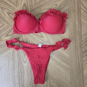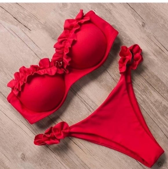 Stylish red bikini set with ruffled details. Perfect for the beach or pool. Bright red as in the first picture. Padded bra.