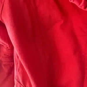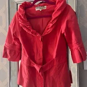 Stylish red jacket with a ruffled collar and tie waist. Perfect for adding a pop of color to any outfit.