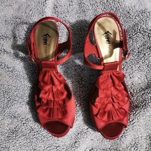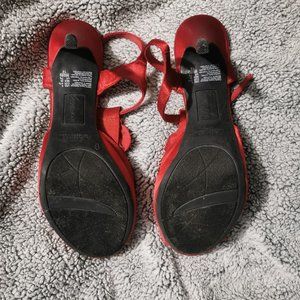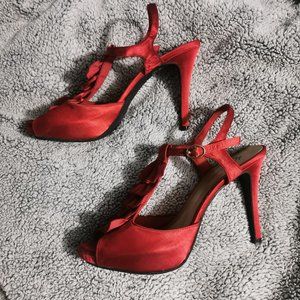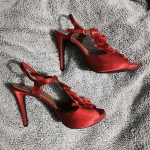 Pre-loved, beautiful red satin slingback heels with ruffle.