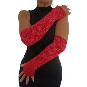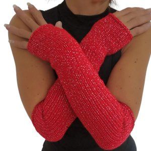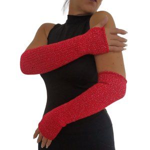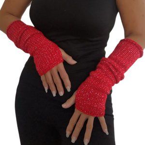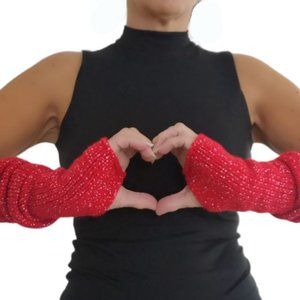 Red Silver Glitter Handmade Knitted Long Fingerless Gloves Valentines Gi…