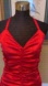 This striking red mini dress features a sleeveless halter neckline and a bodycon fit, perfect for a cocktail night out. The ruched detailing is very figure flattering. Shown fitting perfectly on a size 6 mannequin whose measurements are bust 34” waist 28”.