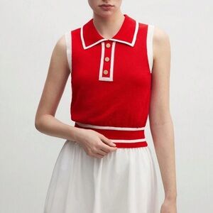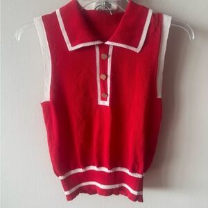 Stylish red sleeveless knit top featuring white trim and button details. Perfect for casual outings.