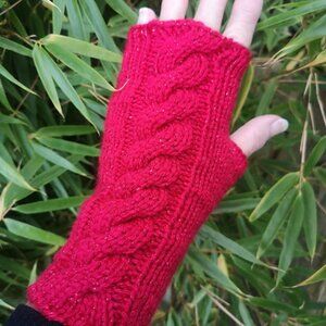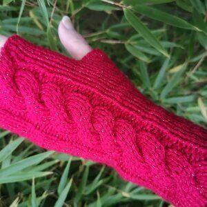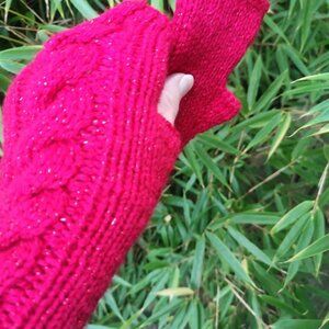 Red Sparkle Glitter Handmade Knit Twist Fingerless Gloves