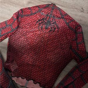 Red mesh top with spider web design. Features a high neck and long sleeves.