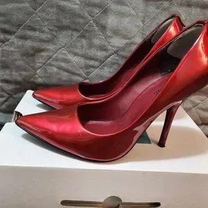 These are a beautiful, shiny red shoe, perfect for your next party. They have a delicate pointed toe (no platform) and a 3.5" skinny heel. Rubber, non-slip soles. Heel reinforcements are included for a comfortable fit.