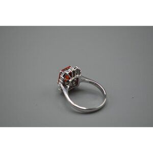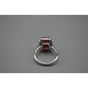 A silver cocktail ring with a rectangle red stone in a halo of clear accent stones. I'm unable to identify the stones. It has a stamp but it's hard to read, looks like it says "AD 925". It weighs 6.90g and is a size 10. In excellent condition, please review photos closely.