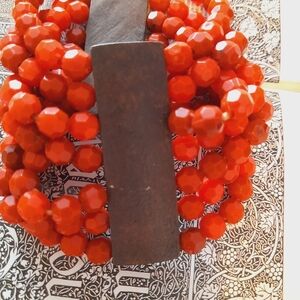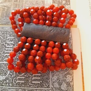red stretchy bracelet 7 strings of beads with wooden accents very good condition