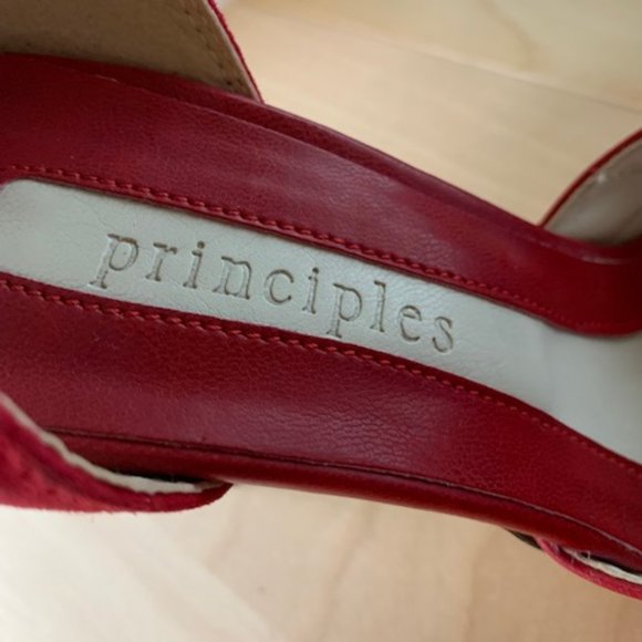 Shoes by Principal, Made in Italy, Size 6. Beautiful Rich RED Suede 2 1/2" high heels, with leather ankle strap . In excellent condition worn 2 times, fully protected in clear plastic shoe box. Hard to find such a rich beautiful colour - next owner can enjoy!