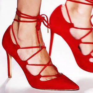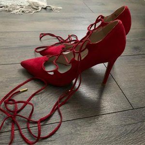 Red Suede Lace-Up Stiletto Pumps - Size 8