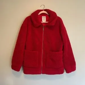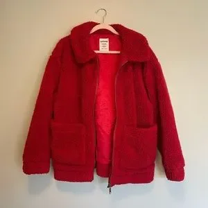 Red fall teddy jacket. Definitely a statement jacket, the red is very vibrant.