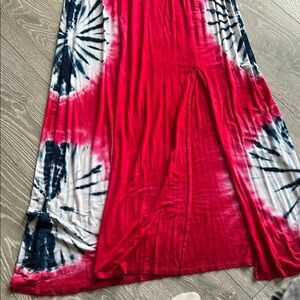 Embrace vibrant style with this stunning red tie-dye maxi dress. Perfect for any occasion, this dress combines comfort and fashion effortlessly. Super flattering with ruching in all the right places. Can wear a bra as the back band is covered.
