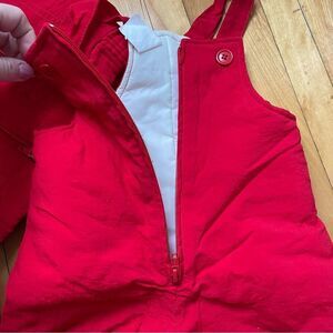 New without tags, Cozy red snowsuit set for toddlers. Includes hooded jacket, bib pants, and snap in mittens, snap on booties. Perfect for winter adventures.