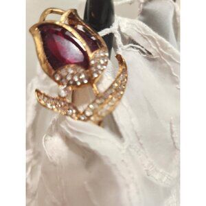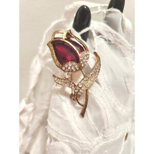 Ruby Red Tulip Brooch with Gold Tone Rhinestones on Faux Gold. Ruby Red Rose Bud with Rhinestone stem and leaf. Very good condition with no damage, lovely gift item to someone who wears brooches. This piece will work well on several pieces of clothing, hats, purses and scarves!