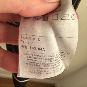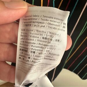 From Valentino Garavani's RED label comes this easy-to-wear black knit tent dress with alternating colored stripes in red, egg yolk yellow, green, pink, and turquoise. The stripes follow the contour of the dress as it gets wider from the top to the bottom of the dress. The dress is a pullover style with a crew neck, bell sleeves, and it's unlined. The fabric is a blend of viscose, polyamide, and cotton (66/22/12), and it's labeled size Small. Please refer to the measurements for the best guidance regarding actual size and compare with a similar garment that fits you.* This dress is stretchy.