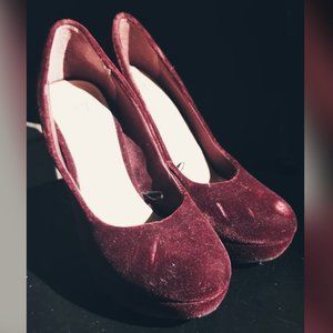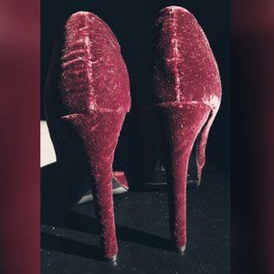 These glamorous dark red / maroon velvet heels have only been worn once for an event. They feature a slight platform and 5-inch heel and are perfect for an event or retro-inspired photo shoot.