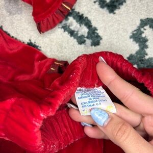 Adorable red velvet baby outfit. Includes a top with ruffled collar and matching pants. Perfect for special occasions.