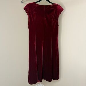 Luxurious velvet gown by London Times. This deep red hue with elegant V-neckline is the definition of classic glamour. The perfect vintage style for a romantic winter date night, a holiday party, or a winter wedding. It is double layered, with light padding on the shoulders for shape and poise.