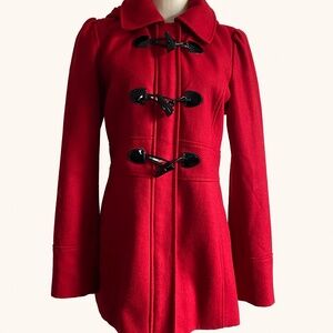Beautiful Red "Guess" Winter 65% wool Coat. Features front zipper closure with a snap at neckline and another at bottom of zipper and 3 button/loop closures. Hood is detachable with 3 buttons. 2 front vertical pockets, wonderful stitching creating wide waist band look.