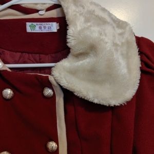 Red winter jacket with double column buttons and removable beige collar piece, 4 buttons at the end of each sleeve, not super thick compared other heavy duty winter jackets. Size says M but feels like a S. Worn twice