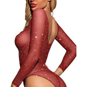 Red Women’s Fishnet Lingerie Sparkly Rhinestone Mesh Teddy Bodysuit Set