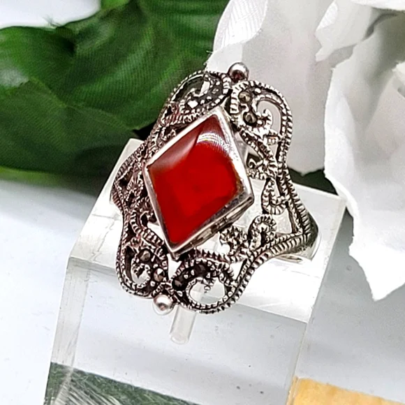 Stunning showpiece, red agate, sterling silver stamped, marcasite stones to make this ring sparkle. Vintage stock brand new.