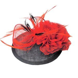 Red and Black Fascinator on Oval Base Sinamay Floral Accent with Feathers