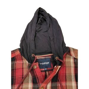 This casual button down shirt showcases a bold red and black plaid design, perfect for a stylish yet relaxed look. The attached black hood adds a unique element, making it suitable for cooler days. Ideal for casual outings, this shirt combines comfort and style effortlessly.
