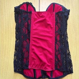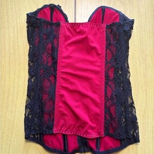 Elegant red corset top with black lace detailing. Perfect for a bold look.