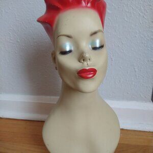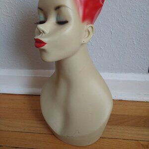 Stylish mannequin head with vibrant red hair and a cream base. Perfect for display or artistic projects.